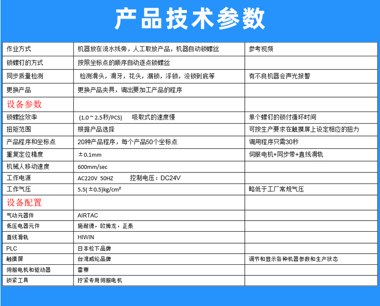 | 產能 | 1.0~1.5秒/PCS | 單個鎖付螺絲循環時間 |